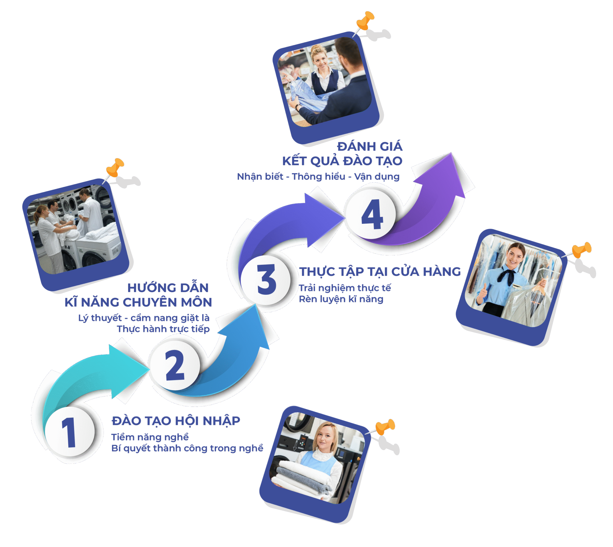 Đến với Trung tâm đào tạo kinh doanh giặt là phía Bắc, học viên sẽ được đào tạo đầy đủ các kỹ năng chuyên môn cần thiết nhất từ cơ bản đến nâng cao, bao gồm cả lý thuyết nền, thực hành trực tiếp dưới sự chỉ dẫn của đội ngũ chuyên gia với nhiều năm kinh nghiệm làm việc thực tế tại các mô hình giặt sấy chuyên nghiệp, trải nghiệm công việc tại cửa hàng và kiểm tra đánh giá kết quả.